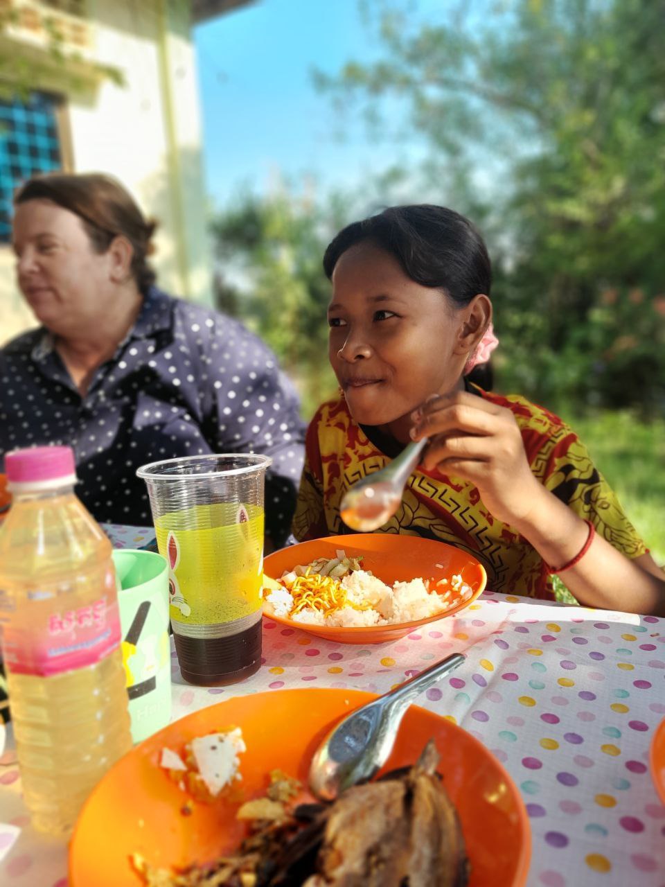 This past month we’ve been teaching the students in the village about “Sharing is Caring” during Values Class. We looked at the different ways we could share and then I challenged them to do something caring for someone in their family or neighborhood. In the last lesson, the students all brought a meal to share, and then the older ones had to give feedback on what they did. It was very special. Everyone brought something to eat ( the majority of our students are very poor, poor as in having to go fish before or after class for small fish or frogs for dinner). It is always so humbling to see how generously they share the little they have. One student shared how he made his grandmother’s favorite meal and gave it to her. His grandmother asked him why he has done this because he has never done something like this. He then said how he “felt nervous and touched in his heart” and explained to his grandma how the teacher taught them about sharing and caring.